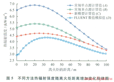 從圖5可以看出,4個計算結(jié)果值呈現(xiàn)出一樣的變化規(guī)律,在下風(fēng)向距離,隨著與火炬距離的增加,熱輻射強度呈現(xiàn)先增加后減少的趨勢。在不同距離取四者數(shù)值進行對比,如表l所示,新模型計算結(jié)果與標準參考值之間的相對誤差除了在10m處為23.09%,其余在30m、50m、70m、90m處均低于l5%;常規(guī)單點源模型計算結(jié)果與標準參考值之間的相對誤差在不同距離處的波動較大,在10m處,相對誤差較火(大于80%),隨著距離的變大,相對誤差有減小的趨勢,但在各點始終均大于新模型與標準參考值之間的相對誤差;而與新模型取相同點源數(shù)的常規(guī)多點源計算結(jié)果與標準參考值之間的相對誤差相比較于單點源計算值減小了許多,但在70m范圍內(nèi)相對誤差仍遠大于新模型計算值,在70m范圍之外,常規(guī)多點源與標準參考值之間的相對誤差才達到可接受的l5%之內(nèi)??傮w來說,相比于與常規(guī)單點源和常規(guī)多點源計算結(jié)果,以數(shù)值模擬的結(jié)果為標準參照,新模型計算出的熱輻射強度有著更高的精度,同時計算復(fù)雜程度沒有提高很多,滿足工程使用的要求,可以在確定高架火炬安全距離得到很好的應(yīng)用與推廣。