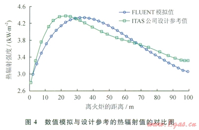 從圖4可以看出,在水平下風(fēng)向的熱輻射分布,數(shù)值模擬結(jié)果與設(shè)計計算參考結(jié)果隨著距火炬距離增加的變化趨勢一致,都是隨著距火炬距離的增加呈現(xiàn)先增加后減小的趨勢。從具體的對比數(shù)值來看,在29m范圍內(nèi),設(shè)計參考值略大于FLUENT模擬值,其中最大誤差為5.8%;在29~68m區(qū)間范圍內(nèi),FLUENT模擬值略大于設(shè)計參考值,其中最大誤差為4.8%;在68~100m區(qū)間范圍內(nèi),設(shè)計參考值又略大于FLUENT模擬值,其中最大誤差6.2%。綜上所述,以ITAS公司設(shè)計參考值為標準,FLUENT的數(shù)值模擬結(jié)果與設(shè)汁參考值吻合得較好,在100m的空間范圍內(nèi),兩者的誤差均保持在10%以內(nèi)。即可以認為FLUENT數(shù)值模擬結(jié)果的精確性是滿足要求的。
