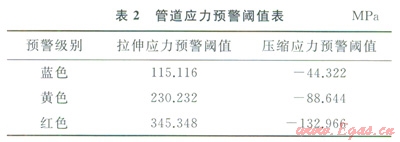 該處管材為X70鋼,管道直徑為1016mm,管道壁厚為14.6mm,設計內部輸送壓力為l0MPa,按操作和安裝溫差20℃計算的管道容許軸向附加拉、壓縮應力分別為383.72MPa和-147.74MPa,相應的應力預警閾值如表2所示。