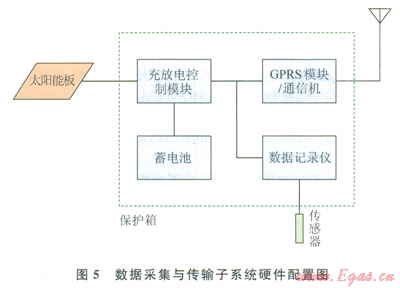 在電源保障上,因數(shù)據采集與傳輸子系統(tǒng)硬件均選用低功耗元器件,配備太陽能和蓄電池供電系統(tǒng)便可實現(xiàn)長期野外工作,基本硬件配置如圖5所示。