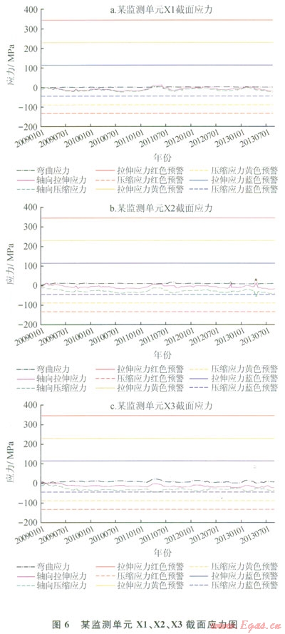 監(jiān)測系統(tǒng)輸出的各應變監(jiān)測截面軸向附加應力如圖6所示。