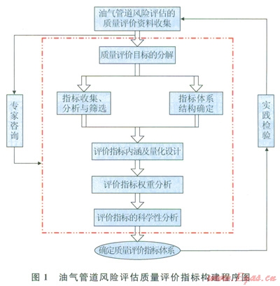 油氣管道風(fēng)險(xiǎn)評(píng)估質(zhì)量評(píng)價(jià)指標(biāo)體系的建立是一個(gè)反復(fù)的過程,涉及資料收集、評(píng)價(jià)目標(biāo)分解、指標(biāo)體系結(jié)構(gòu)確定、指標(biāo)的收集和篩選、指標(biāo)內(nèi)涵及量化性設(shè)計(jì)、指標(biāo)權(quán)重分析、指標(biāo)體系的篩選和分析、指標(biāo)體系科學(xué)性分析(有效性分析、敏感性分析)等步驟。在評(píng)價(jià)指標(biāo)體系的建立過程中,專家咨詢法將貫穿其中每一個(gè)環(huán)節(jié),最后構(gòu)建出的指標(biāo)體系結(jié)構(gòu)還應(yīng)該在實(shí)踐中檢驗(yàn)其有效性,才能在實(shí)際評(píng)價(jià)中應(yīng)用。油氣管道風(fēng)險(xiǎn)評(píng)估的質(zhì)量評(píng)價(jià)指標(biāo)體系的建立程序如圖l所示。