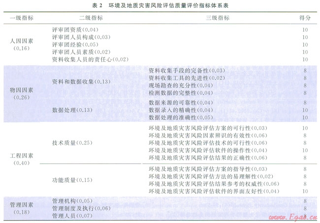 專家組根據(jù)環(huán)境及地質(zhì)災(zāi)害專項(xiàng)風(fēng)險(xiǎn)評(píng)價(jià)的特點(diǎn),在圖2所示質(zhì)量評(píng)價(jià)體系結(jié)構(gòu)的基礎(chǔ)上制訂出一套有針對(duì)性的質(zhì)量評(píng)價(jià)指標(biāo)體系(表2),其中括號(hào)內(nèi)為各指標(biāo)權(quán)重值。