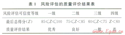 得出油氣管道風(fēng)險(xiǎn)評(píng)估質(zhì)量評(píng)價(jià)的總得分2后,就容易判斷最終整體上管道風(fēng)險(xiǎn)評(píng)估質(zhì)量的優(yōu)劣,從而為項(xiàng)目的驗(yàn)收和今后類似油氣管道風(fēng)險(xiǎn)評(píng)估工作的開展提供依據(jù)和參考借鑒。根據(jù)油氣管道風(fēng)險(xiǎn)評(píng)估質(zhì)量評(píng)價(jià)總得分的不同,一般而言可以將油氣管道風(fēng)險(xiǎn)評(píng)估的可信度劃分為4個(gè)等級(jí),劃分標(biāo)準(zhǔn)如表l所示。