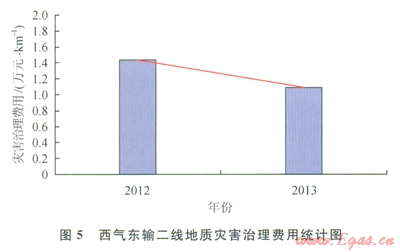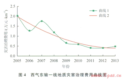 西氣東輸管道地質(zhì)災(zāi)害維護費用統(tǒng)計如圖4、5所示,圖4中的曲線l為管道地質(zhì)災(zāi)害風險治理維護費用曲線,曲線2為二次擬合曲線。2條曲線的趨勢表明:西氣東輸一線在開展地質(zhì)災(zāi)害完整性管理后,管道地質(zhì)災(zāi)害風險治理維護費用逐年降低,當前治理費用水平約為2005年的l/4,并趨近于穩(wěn)定水平。圖5數(shù)據(jù)表明西氣東輸二線投產(chǎn)第一年地質(zhì)災(zāi)害治理費用與西氣東輸一線2005年相比減少約l/3,且治理費用逐年下降。2013年西氣東輸二線治理費用比西氣東輸一線約高l倍,預(yù)計未來幾年堅持管道地質(zhì)災(zāi)害完整性管理后,西氣東輸二線地質(zhì)災(zāi)害管理將逐步趨于穩(wěn)定水平。