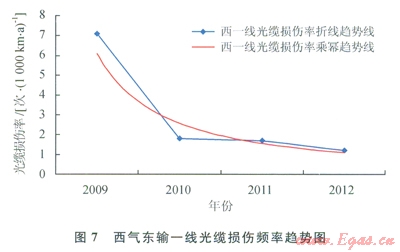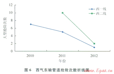 圖7表明,西氣東輸一線管道斷纜頻率由2009年的7.1次/(1090km·a)降至2010年的l.8次/(1000km·a),并呈逐年下降之勢,說明2009年開始逐步實施第三方損壞完整性管理工作后,施工機械等可能威脅管道安全的第三方施工次數(shù)顯著減少,管道安全水平逐步提高。由圖8可以看出,2011年西氣東輸二線投產(chǎn)運行初,在第三方損壞完整性管理指導下光纜中斷次數(shù)處于較低水平,并呈下降趨勢。