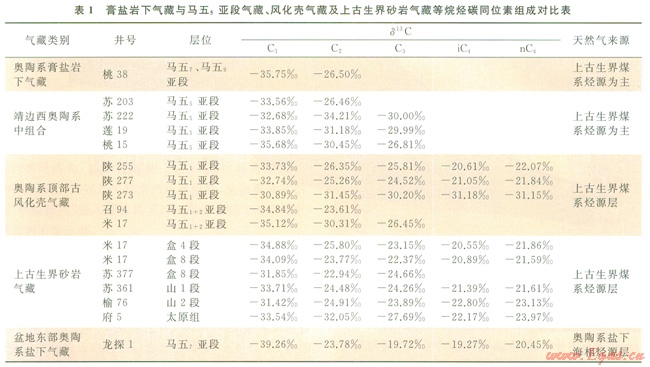 靖邊氣田西北側(cè)已有1口探井(桃38井),奧陶系馬家溝組馬五段地層保存齊全,在鉆穿馬五6亞段膏鹽巖層后,于馬五7、馬五9亞段白云巖中見到較好的含氣顯示(氣層距奧陶系頂面風(fēng)化殼超過200m),后經(jīng)酸化改造、試氣獲得l2.91×104m3/d的較高產(chǎn)工業(yè)氣流,成為盆地內(nèi)首次在膏鹽巖下深層獲得工業(yè)氣流的探井,產(chǎn)層天然氣樣品的甲烷碳同位素值為-35.75‰,乙烷碳同位素值為-26.50‰,與盆地本部來源于上古生界煤系烴源巖的奧陶系頂部風(fēng)化殼氣藏、上古生界砂巖氣藏、奧陶系中組合馬五5亞段氣藏等的天然氣烷烴碳同位素組成基本一致(表1)。這類煤系烴源氣藏的甲烷碳同位素值一般在-30‰~-36‰之間,乙烷碳同位素值為-23‰~-30‰之間[18-22],證實(shí)了膏鹽巖下圈閉的有效性及氣源主要來自上古生界煤系烴源巖的基本成藏特征。另外,近期通過靖邊氣田勘探早期鉆入膏鹽巖下深層的探井復(fù)查分析,也發(fā)現(xiàn)l0余口探井在膏鹽巖下有一定的含氣顯示,但由于當(dāng)初勘探重點(diǎn)是奧陶系頂部的馬五1+2亞段風(fēng)化殼氣藏,對(duì)馬五5亞段及以下的中下組合含氣層系認(rèn)識(shí)不足,加之個(gè)別井試氣效果不理想,也就沒有進(jìn)一步深入勘探之。