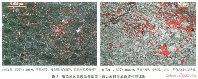 2)具有規(guī)模發(fā)育的白云巖儲(chǔ)集體。處于馬五6亞段膏鹽巖分布區(qū)之下的馬五7、馬五9亞段白云巖沉積時(shí)主體處于靖西臺(tái)坪沉積區(qū),多發(fā)育有利的顆粒灘相沉積,后期白云巖化可形成規(guī)模分布的白云巖晶間孔型儲(chǔ)集體。