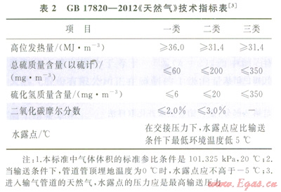 GB l7820規(guī)定了經(jīng)過處理并通過管道輸送的商品天然氣分類和技術(shù)要求[3],為天然氣工業(yè)的發(fā)展制定了一個(gè)統(tǒng)一的產(chǎn)品要求(表2)。其中發(fā)熱量、總硫含量、硫化氫含量、二氧化碳含量和水露點(diǎn)5項(xiàng)關(guān)鍵控制性技術(shù)指標(biāo)體現(xiàn)安全衛(wèi)生、環(huán)保和經(jīng)濟(jì)效益要求,而一類氣指標(biāo)與歐、美、俄處于同等水平,實(shí)現(xiàn)與國(guó)際接軌,保障了進(jìn)口天然氣質(zhì)量,為天然氣質(zhì)量控制提供了依據(jù)。