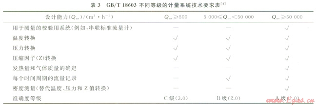 參考0IML Rl40和ENl776,GB/T l8603規(guī)定了新建和改擴(kuò)建的天然氣計(jì)量站貿(mào)易計(jì)量系統(tǒng)的設(shè)計(jì)、配置、建設(shè)、投產(chǎn)運(yùn)行、維護(hù)方面的技術(shù)要求[4](表3),同時(shí)給出了計(jì)量系統(tǒng)儀表的準(zhǔn)確度要求(表4)。成為計(jì)量站建設(shè)和運(yùn)行維護(hù)的依據(jù)。