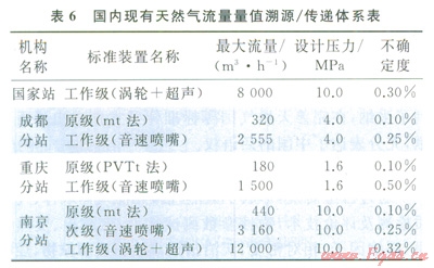 20世紀(jì)80年代,我國(guó)開始在四川成都建設(shè)天然氣流量標(biāo)準(zhǔn)裝置。l996年通過自主研發(fā),建成質(zhì)量時(shí)間法原級(jí)標(biāo)準(zhǔn)裝置,達(dá)到“90年代中期國(guó)際同類裝置的先進(jìn)水平”(亞洲一流)。目前,已建立0.1%的原級(jí)標(biāo)準(zhǔn)及配套的傳遞標(biāo)準(zhǔn)和工作標(biāo)準(zhǔn)裝置,形成了完整的量傳溯源體系(表6)。