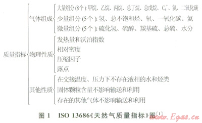 國(guó)際標(biāo)準(zhǔn)化組織(ISO)于1998年發(fā)布ISO13686《天然氣質(zhì)量指標(biāo)》,成為全世界天然氣質(zhì)量控制的指導(dǎo)性準(zhǔn)則和各國(guó)之間簽訂天然氣貿(mào)易合同的指南。該國(guó)際標(biāo)準(zhǔn)明確規(guī)定了天然氣質(zhì)量必須滿足安全衛(wèi)牛、環(huán)境保護(hù)、經(jīng)濟(jì)利益3個(gè)方面要求。其對(duì)天然氣質(zhì)量控制參數(shù)、測(cè)量單位和測(cè)量方法標(biāo)準(zhǔn)進(jìn)行了規(guī)定(圖1) [1]。