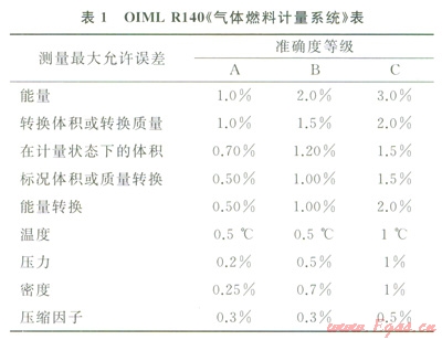 國(guó)際法制計(jì)量組織(OIML)于l998年發(fā)布Rl40《氣體燃料計(jì)量系統(tǒng)》[2],作為天然氣流量計(jì)量的指導(dǎo)性準(zhǔn)則和各國(guó)簽訂天然氣貿(mào)易合同的指南。該技術(shù)文件對(duì)天然氣流量計(jì)量系統(tǒng)準(zhǔn)確度等級(jí)和能量、質(zhì)量、體積、參數(shù)換算、壓力、溫度、密度、壓縮因子的測(cè)量最大允許誤差等技術(shù)要求進(jìn)行了詳細(xì)規(guī)定(表1) [2]。