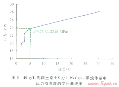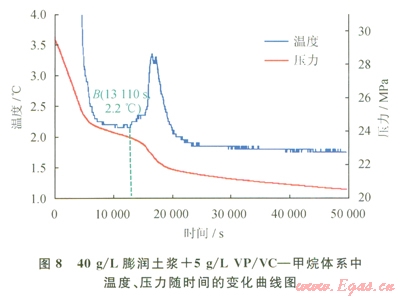 VP/VC屬于第二代天然氣水合物動力學(xué)抑制劑,由N-乙烯基吡咯烷酮和N-乙烯基己內(nèi)酰胺共聚而成。圖7、8反映了加入VP/VC后膨潤土漿中水合物的生成過程。