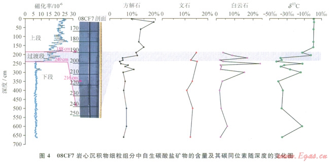 方解石在所分析的樣品中均有出現(xiàn),含量為4.2%~18.2%,平均含量為8.3%,表層至188cm的樣品中方解石含量較l88cm以下樣品的方解石含量高。文石和白云石僅出現(xiàn)在188cm以下的樣品中,分別為10.3%~l4.4%和l.4%~22.6%(圖4),表明08CF7巖心以188cm為界,上部分和下部分在成巖環(huán)境等方面存在明顯差異。