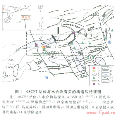 08CF7站位位于南海北部神狐海區(qū)。該海區(qū)位于南海北部陸坡中段,界于兩沙海槽和東沙群島之間,構(gòu)造上處于珠江口盆地珠Ⅱ凹陷,自中新世以來進(jìn)入構(gòu)造沉降[30]。新生代沉積厚度介于1000~7000m,有機(jī)質(zhì)含量為0.2%~l.9%[5,29]。水深800~2000m,海底地形復(fù)雜且坡度變化較大。高分辨率地球物理調(diào)查表明,該海域廣泛發(fā)育斷裂一褶皺體系、泥火山、泥底辟等構(gòu)造,且海底以下150~350m廣泛分布BSR,具有較好的水合物形成和賦存的地質(zhì)條件 [5,18,21],且于2007年在該海區(qū)成功鉆取到水合物實物樣品[31]。