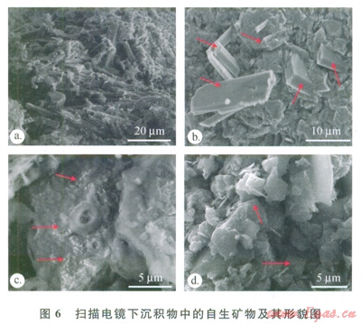 自生碳酸鹽礦物主要呈細(xì)粒狀發(fā)育在沉積物中,在掃描電子顯微鏡下,原樣中的文石呈針狀生長在沉積物中(圖6-a),沒有發(fā)現(xiàn)沿孔隙生長的簇狀文石,而在細(xì)粒組分中,文石呈碎屑狀出現(xiàn)(圖6-b)。白云石呈微晶狀發(fā)育在黏土團(tuán)塊中(圖6-c),周圍有l0mm的滲漏微孔。在原樣中沒有觀察到方解石顆粒,但在細(xì)粒組分中可觀察到方解石呈棱形體零星地散布在細(xì)粒組分中(圖6-d),顆粒一般為2~15mm。這些觀察表明,沉積物中發(fā)育自生碳酸鹽礦物,但其顆粒細(xì)小且分散在沉積物中,未發(fā)育成塊狀碳酸鹽巖。