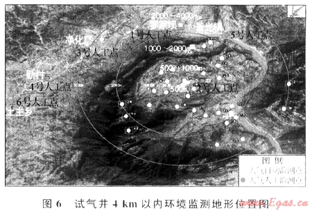 擴散模型計算的參數(shù)為原料氣組分體積分數(shù)(CH470.6%、H2S20.0%、CO28.93%),原料氣量(70×104m3/d),爐膛設計排出氣體速度(21.23m/s),排出溫度(924℃),氣井所處地形、地貌及氣象等數(shù)據(jù);模型計算采用的試氣井及周邊10km范圍10個濃度聚集點的地形位置參見圖3。
