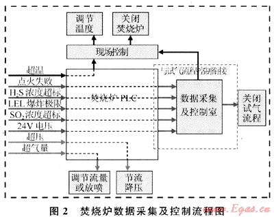 當焚燒爐2套點火系統(tǒng)點火失敗、監(jiān)測點可燃氣體達到爆炸極限或者SO2、H2S濃度超標時,焚燒爐控制系統(tǒng)將向井場數(shù)據(jù)采集控制系統(tǒng)發(fā)出緊急關斷報警信號,并關閉井口;當超溫、超壓或超氣量時,焚燒爐控制系統(tǒng)將向井場數(shù)據(jù)采集控制系統(tǒng)發(fā)出緊急關斷報警信號,并進行調節(jié)[3~6]。具體邏輯控制流程見圖2。