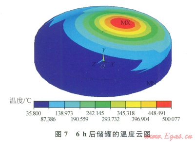 火災(zāi)發(fā)生6h時(shí)后,穹頂?shù)耐獗砻鏈囟纫呀?jīng)升高到了500℃左右,同時(shí)高溫區(qū)域也增大了很多(圖7)。