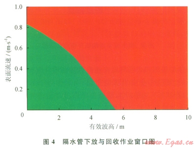 隔水管的下放/回收作業(yè)窗口如圖4所示(具體數(shù)據(jù)略)。圖4中綠色部分為允許作業(yè)區(qū)域,紅色區(qū)域為不允許在該配置下進(jìn)行下放/回收的環(huán)境條件。