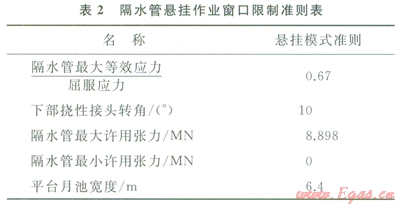 在計算隔水管懸掛作業(yè)窗口時,同樣也需要首先明確隔水管懸掛作業(yè)窗口的限制準(zhǔn)則,參考相關(guān)研究成果[6,11],確定的隔水管懸掛作業(yè)窗口限制準(zhǔn)則見表2。
