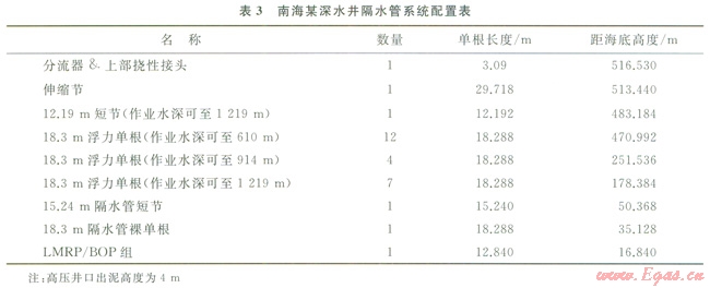 依據(jù)前述的隔水管設(shè)計技術(shù),針對某深水鉆井平臺隔水管配備情況,參考API RP l6Q規(guī)范[10]設(shè)計出的隔水管系統(tǒng)見表3。