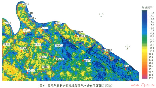 另外從預測的元壩氣田l區(qū)塊長興組氣水分布平面圖(圖6)來看,整體上有利含氣區(qū)主要分布在西邊及北邊,東南邊多為產(chǎn)水區(qū)及氣水同層區(qū),其刻畫的氣水平面展布與實鉆井揭示的規(guī)律基本上保持一致。從圖6中可以看到:含氣區(qū)(紅黃色區(qū)域)與含水區(qū)(藍色區(qū)域)分布清晰。處于黃色區(qū)域(紅圈內(nèi))的井,均獲得了工業(yè)性氣流。尤其處于紅黃色富集區(qū)域的YBl04井以及YB10cl井,獲得了日產(chǎn)天然氣過百萬立方米的產(chǎn)能。藍色區(qū)域則為含水區(qū)(圖中黑圈內(nèi)),處于該區(qū)域的YB9井在長興組鉆遇水層,日產(chǎn)水30m3。綠色區(qū)域為氣水同層區(qū),該區(qū)域的YBl23井、YBl6井測試結(jié)果既產(chǎn)氣也產(chǎn)水。