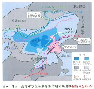 早先發(fā)生的南海運(yùn)動(dòng)使白云凹陷最終在距今23.8Ma被充填均夷化,古珠江三角洲推進(jìn)到白云凹陷,陸架坡折帶發(fā)育在白云凹陷南坡。因此,在距今32.0~23.8Ma,白云凹陷發(fā)育了與珠一坳陷珠海組相似的淺海三角洲濱岸砂巖沉積組合。此時(shí),深水沉積位于坡折帶下方的荔灣凹陷(荔灣凹陷在珠海組沉積中期先轉(zhuǎn)為深水沉積)。