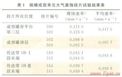 但在水造粒成型工藝中,液硫和硫磺顆粒本身具有腐蝕性,若液硫未脫氣或脫氣效果不好,則工藝介質(zhì)的酸性可能很強(qiáng),酸性濕氣進(jìn)入大氣中也具有一定的腐蝕性,對(duì)設(shè)備管線安全運(yùn)行構(gòu)成威脅。國(guó)內(nèi)專門(mén)針對(duì)硫磺成型設(shè)備的腐蝕雖已有報(bào)道[4-7],但對(duì)硫磺成型設(shè)備外部結(jié)構(gòu)鋼、閥門(mén)、硫磺顆粒傳送帶周圍鋼結(jié)構(gòu)的大氣腐蝕則未引起足夠的重視。經(jīng)過(guò)實(shí)地腐蝕調(diào)研,筆者發(fā)現(xiàn)硫磺成型單元外部結(jié)構(gòu)鋼、閥門(mén)、硫磺顆粒傳送帶周圍鋼結(jié)構(gòu)以及頂棚等都存在腐蝕隱患。本文采用現(xiàn)場(chǎng)掛片法對(duì)硫磺成型單元大氣腐蝕行為進(jìn)行分析,擬為凈化廠硫磺回收裝置的安全運(yùn)行提供技術(shù)依據(jù)。