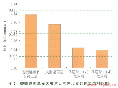 1)高含硫凈化廠硫磺成型單元大氣腐蝕不可忽視,尤其在硫磺成型罐周圍,因溫度較高、空氣濕度較大,加上液硫帶入的少量酸性氣,失重腐蝕速率超出凈化廠腐蝕控制標(biāo)準(zhǔn)。