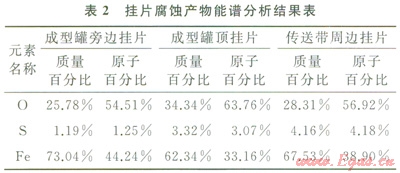2)通過(guò)掃描電鏡觀察,發(fā)現(xiàn)腐蝕掛片表面形成片狀腐蝕產(chǎn)物;能譜顯示腐蝕產(chǎn)物主要含Fe、O元素和少量S元素。分析其腐蝕機(jī)理,腐蝕產(chǎn)物主要呵能是FeOOH、FeSO4、Fe2O3和Fe3O4。
