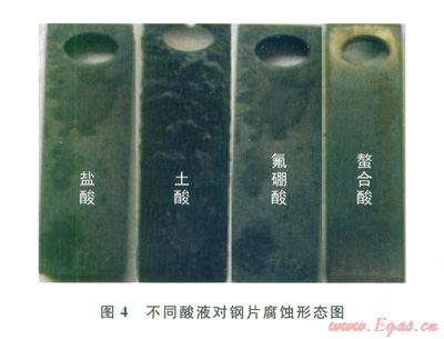從圖4中可以看出,螯合酸腐蝕不是很明顯,表面附著少許薄膜,且表面光鮮明亮,而其他3種無機酸液對鋼片腐蝕嚴(yán)重,表面有黑色的物質(zhì),同時具有明顯的腐蝕溝槽。