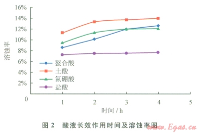 實驗設(shè)計了4種酸液與某油氣田沙河街組儲層的巖粉反應(yīng),對比在1h、2h、3h、4h酸液對巖粉的溶蝕率,以及最終的溶蝕率,研究螯合酸液體系的緩速性能。實驗溫度l30℃,實驗4種酸液分別為:10%HCl、10Y00 HCl+2%HF、10%HCl+8%HBF4、l0%螯合酸。實驗結(jié)果表明(圖2):鹽酸與巖粉反應(yīng)速率最快,溶蝕率最低,土酸與巖粉反應(yīng)溶蝕率最高,在2h反應(yīng)基本完成,氟硼酸溶蝕率比螯合酸略低;鹽酸溶蝕率基本保持在7.5%,土酸溶蝕率在2h變化較大,之后基本無很大變化,溶蝕率最高達(dá)l3.9%,螯合酸表現(xiàn)出明顯的緩速性能,隨著反應(yīng)時間延長,螯合酸溶蝕率逐漸升高,最高達(dá)l2.6%。