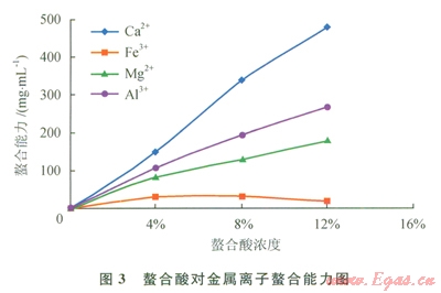 螯合酸對鈣離子螯合能力最強,對鐵離子螯合能力較弱,隨著螯合酸濃度的升高,對鈣、鎂、鋁螯合能力逐漸增強,當(dāng)螯合酸濃度為l2%時,鈣離子螯合能力最高達(dá)到480mg/mL,鎂離子螯合能力180mg/mL,鋁離子螯合能力268mg/mL,對鐵離子螯合能力隨著螯合劑濃度增加而降低,濃度8%時鐵離子穩(wěn)定能力為30mg/mL,濃度l2%時為17mg/mL,綜合螯合酸對幾種金屬離子的蝥合能力,當(dāng)螯合劑濃度為l0%,可以實現(xiàn)對4種金屬離子高效螯合(圖3)。