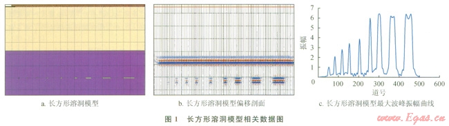 圖1-b為長方形溶洞模型正演偏移剖面,從中可以看出隨著溶洞寬度的增加,溶洞對應(yīng)位置的振幅是增加的。為了更直觀地了解振幅的變化,以偏移剖而中550~700ms(溶洞對應(yīng)位置)間每一道的最大波峰振幅為縱坐標(biāo),道號為橫坐標(biāo),得到長方形溶洞模型偏移剖面最大波峰振幅曲線圖(圖1-c)。從圖1-c可以直觀看到:當(dāng)溶洞寬度小于250m時,隨著溶澗寬度的增大,最大波峰振幅是在增大的;當(dāng)溶洞寬度大于250m時,振幅幾乎不受溶洞寬度影響。
