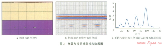 圖2-b是橢圓形溶洞偏移剖面,圖2-c為橢圓形溶洞最大波峰振幅曲線圖;圖3-b、圖3-c分別是菱形溶洞偏移剖面及最大波峰振幅曲線圖??梢钥吹剑瑹o論是橢圓形模型還是菱形模型,隨著溶洞橫向尺度的增加最大波峰振幅是增加的,這和長方形溶洞正演模擬結(jié)果很相似。