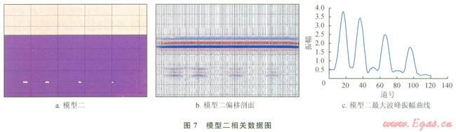 圖6、7分別是模型一和模型二的相關(guān)數(shù)據(jù),由圖6-c可知,模型一中溶洞對應(yīng)振幅的關(guān)系為:長方形溶洞>不規(guī)則溶洞>半圓形溶洞,這與溶洞面積關(guān)系是一致的,且模型一中第l個溶洞和第3個溶洞形態(tài)大小差距很小,但在最大波峰振幅曲線上依然可以將兩者區(qū)分開,由圖7-c可知模型二也有相似的結(jié)論,故而在菲涅爾帶內(nèi)溶洞形態(tài)對于振幅是敏感的。