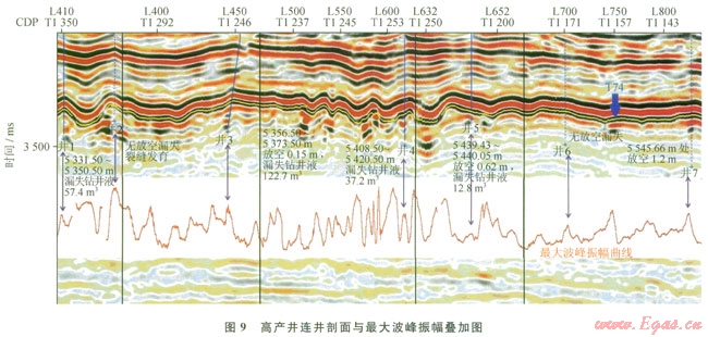 圖9為某區(qū)塊連井剖面與其儲層段最大波峰振幅曲線疊合圖。由圖9可見,這些井除井2、井6外,都設(shè)計在“串珠”或“羊排”這些具有溶洞反射特征的位置上,同時它們都對應(yīng)著最大波峰振幅曲線的極大值點(diǎn),且井l、井3、井4、井5和井7都有鉆具放空、鉆井液漏失等表征溶洞發(fā)育的證據(jù),而井2位于兩“串珠”之間,井6未在“串珠”上,這兩口井均無放空漏失現(xiàn)象,即是無溶洞發(fā)育,可見振幅曲線出現(xiàn)極值是溶洞反射特征之一,但并不是所有極值都意味著溶洞發(fā)育。隨著這些井對應(yīng)振幅的減小,其產(chǎn)量總的來說是減小的,而產(chǎn)量作為一種衡量溶洞大小及發(fā)育程度的指標(biāo),可見反射振幅越大的溶洞,其尺寸越大,發(fā)育程度越高,這與前面的結(jié)論是相符合的。所以通過這種手段識別溶洞,可指導(dǎo)實(shí)際生產(chǎn),提高鉆探成功率。