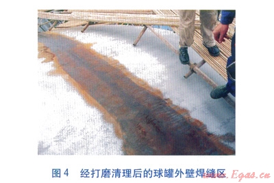 ④球罐內(nèi)外壁焊縫區(qū)打磨清理