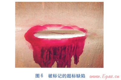 在特種設(shè)備檢測(cè)機(jī)構(gòu)對(duì)球罐全面檢測(cè)后,對(duì)超標(biāo)缺陷進(jìn)行分析、標(biāo)記,球罐管理單位需對(duì)超標(biāo)缺陷進(jìn)行返修,直至特種設(shè)備檢測(cè)機(jī)構(gòu)對(duì)返修后的缺陷檢測(cè)復(fù)核合格為止。超標(biāo)缺陷返修處理難度大,技術(shù)要求高,返修方案須經(jīng)過原設(shè)計(jì)單位或者具備相應(yīng)資質(zhì)的設(shè)計(jì)單位同意,是開罐檢驗(yàn)過程中的最大難點(diǎn)。被標(biāo)記的超標(biāo)缺陷見圖6。