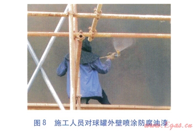 為保證球罐外壁的防腐質(zhì)量,要求對(duì)球罐外壁進(jìn)行噴砂除銹處理,除銹等級(jí)達(dá)到Sa2.5級(jí)(非常徹底的噴射或拋射除銹)。施工人員對(duì)球罐外壁進(jìn)行噴砂除銹、噴涂防腐油漆分別見圖7、8。
