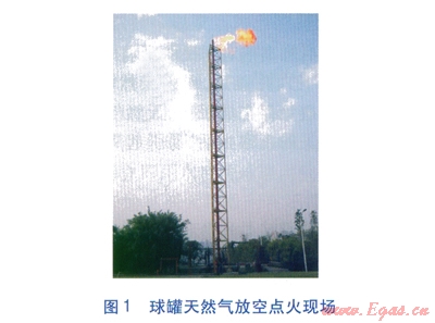 先將球罐內(nèi)天然氣壓力降至與城市燃?xì)夤芫W(wǎng)壓力一致,通過儲(chǔ)配站中的點(diǎn)火塔將球罐內(nèi)余氣燃燒掉,直至球罐內(nèi)天然氣壓力與大氣平衡,再打開球罐上下入孔蓋。球罐天然氣放空點(diǎn)火現(xiàn)場(chǎng)見圖1。