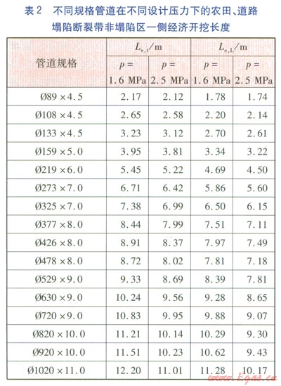 采用前面計(jì)算方法,分別計(jì)算出農(nóng)田、道路塌陷區(qū)對(duì)應(yīng)的上,并將表1數(shù)據(jù)代入式(16),可計(jì)算得不同規(guī)格管道在不同設(shè)計(jì)壓力下農(nóng)田、道路塌陷斷裂帶非塌陷區(qū)一側(cè)經(jīng)濟(jì)開(kāi)挖長(zhǎng)度Le,t、Le,L,見(jiàn)表2。