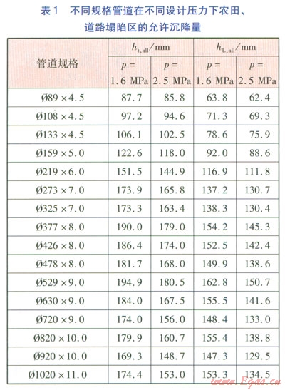 由式(9)~(12)可計(jì)算得到,不同規(guī)格管道在設(shè)計(jì)壓力分別為1.6、2.5MPa下,農(nóng)田、道路塌陷區(qū)的允許沉降量(見(jiàn)表l)。