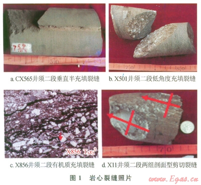 通過(guò)對(duì)巖心縫面觀察、薄片微觀裂縫的鑒定,該區(qū)超過(guò)80%的天然裂縫縫面平滑干凈,無(wú)明顯充填特征,少數(shù)天然裂縫縫面見(jiàn)不同程度方解石充填(圖1-b)、石英充填和有機(jī)質(zhì)充填(圖1-c);另外泥質(zhì)巖類(lèi)縫面也見(jiàn)剖面型擦痕(圖l-d),表明存在剪性裂縫。
