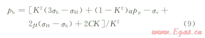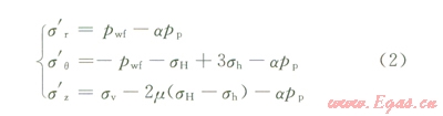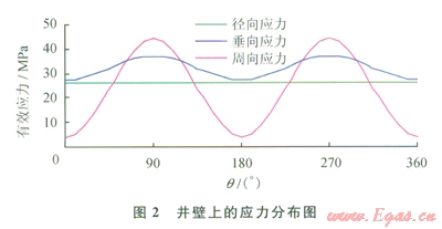 式中s′r、s′q、s′z,分別為井壁徑向、周向、垂向的有效應力;pwf井內(nèi)液柱壓力;pp為地層壓力;m為巖石泊松比;m為井周角(井壁上某點的失徑與最大水平地應力方位的夾角) sH、sh分別為最大、最小水平地應力。