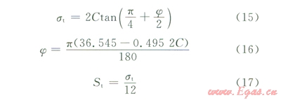 地層強度參數(shù)中對井壁穩(wěn)定性產(chǎn)生直接影響的是黏聚力和內(nèi)摩擦角,筆者認為,黏聚力和內(nèi)摩擦角是巖石相互關(guān)聯(lián)的兩個強度參數(shù),地層強度的改變會導致二者同時發(fā)生變化,不應將二者的影響單獨分析,而應直接以單軸強度作為變化量進行研究。假設地層強度參數(shù)服從關(guān)系式(15)[23],且黏聚力和內(nèi)摩擦角滿足經(jīng)驗關(guān)系式(16)[24],則可用地層單軸抗壓強度同時表征黏聚力和內(nèi)摩擦角的變化。分析時還應當考慮地層強度變化對拉伸強度的影響,地層抗拉強度(St)與單軸抗壓強度(st)的關(guān)系由三維Griffith準則[23]給出,滿足式(17)。