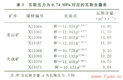 從實驗結(jié)果可以看出,瓦斯壓力和瓦斯含量具有指數(shù)關系,對圖2、3的瓦斯含量和瓦斯壓力數(shù)據(jù)擬合分析,可得出瓦斯壓力0.74MPa對應的瓦斯含量(表3)。從該表可以看出,龍山礦無煙煤瓦斯壓力0.74MPa對應的瓦斯含量為l0.9~12.6m3/t,平均為11.58m3/t;大眾礦貧煤對應的瓦斯含量為9.04~10.7m3/t,平均為9.76m3/t。從實驗結(jié)果可以認為,龍山礦瓦斯含量在10.9m3/t就有可能具有突出危險性;而大眾礦瓦斯含量在9.04m3/t就可能發(fā)生突出。