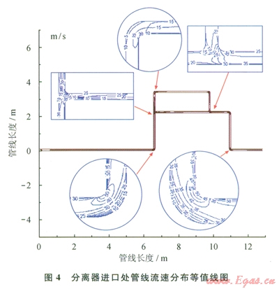 介質(zhì)在管道輸運過程中,由于其內(nèi)部流道的變化,局部的流速會遠遠高于整體流速,加之紊流作用影響,因此必定會加劇影響腐蝕速率。圖1所示管線的內(nèi)流場模擬結果見圖4、5所示。